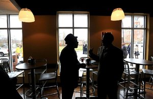Lloyd Huskey (left) and Albert Jones talk inside the First Security Community Union during its formal grand opening Tuesday on the Arkansas Baptist College campus in Little Rock.