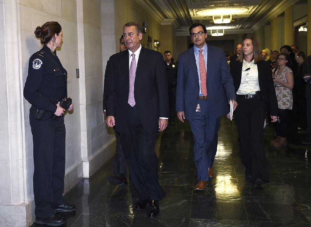 House Speaker John Boehner (second from left), arrives Wednesday for a meeting on Capitol Hill. The House passed a two-year budget plan Wednesday in a deal brokered by Boehner as he prepares to resign from office.
